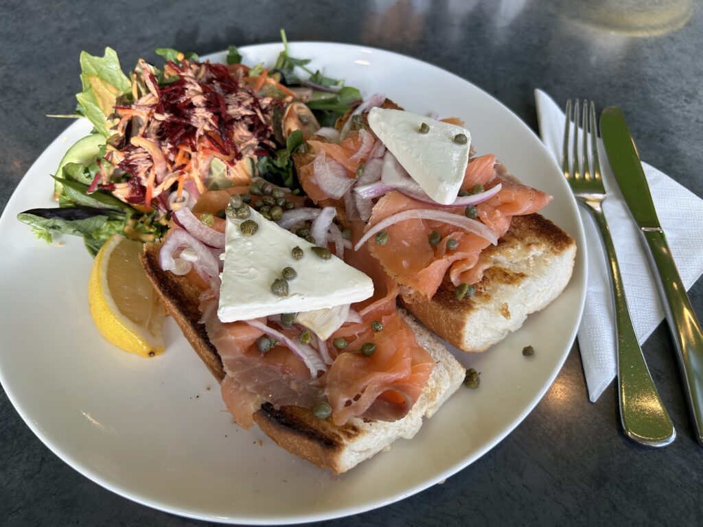 スモークサーモンとクリームチーズのサンドイッチとカフェオレで2,918円。味は美味しかったけれど、量が多めで完食に苦戦……!ここでもAMEXは使えず、VISAで支払いました。