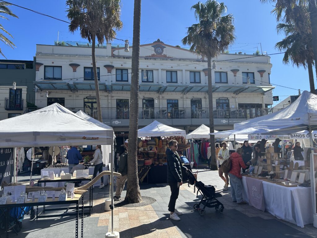 マンリーワーフに到着し、早速ビーチへ。周辺にはおしゃれなカフェやレストランが並び、ちょうど日曜日だったこともあってマーケットも開催されていました。