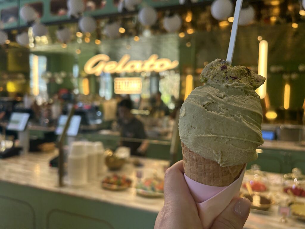選んだのは ピスタチオのジェラートを普通サイズのコーンで(772円)。私には少し甘めでしたが、濃厚で美味しくいただきました。