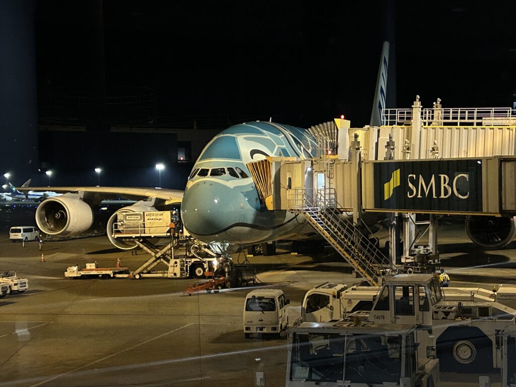 万全の準備を整え、ANAのマイルで取ったフライングホヌの深夜便に乗り込み、いざ出発。