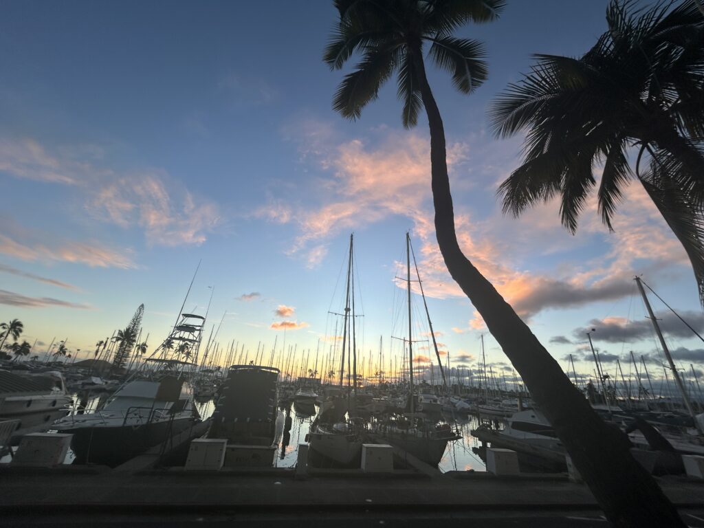 夕日を望むテラス席で、ハワイ初日を気分良く締めくくることができました。