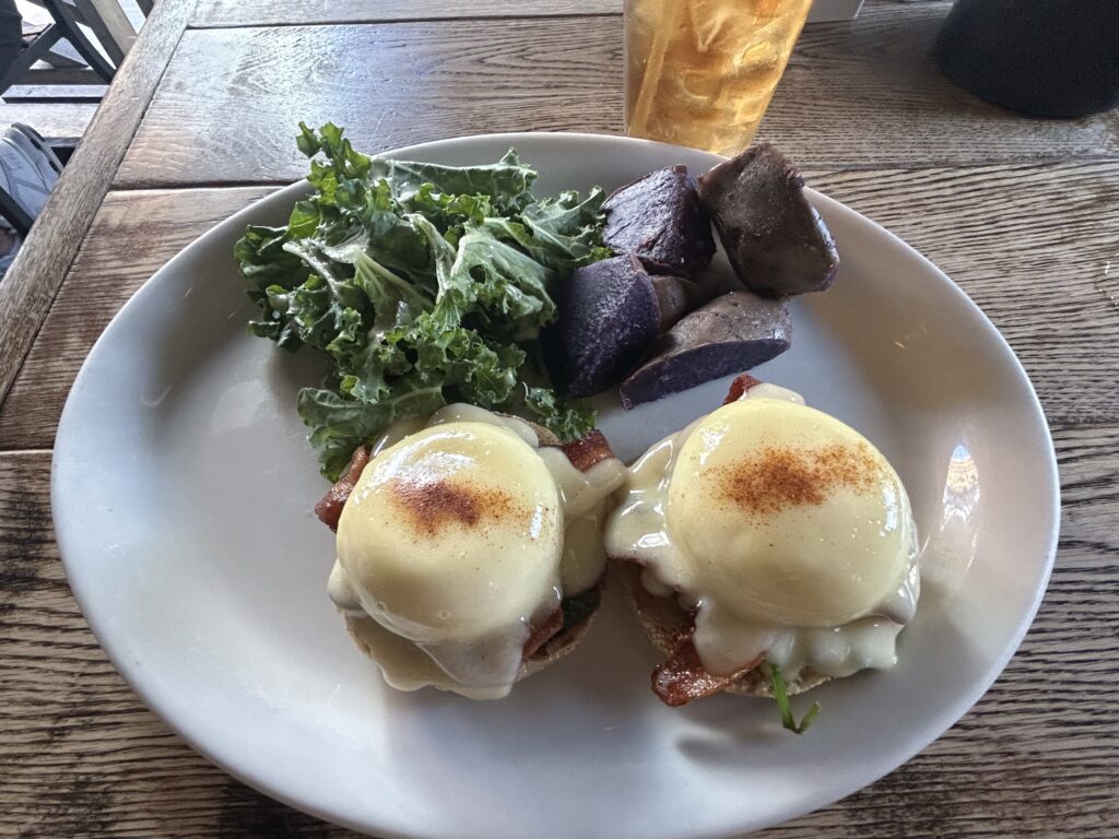 口コミで評判の良かった、ベーコンとほうれん草のエッグベネディクトとアイスティーを注文。