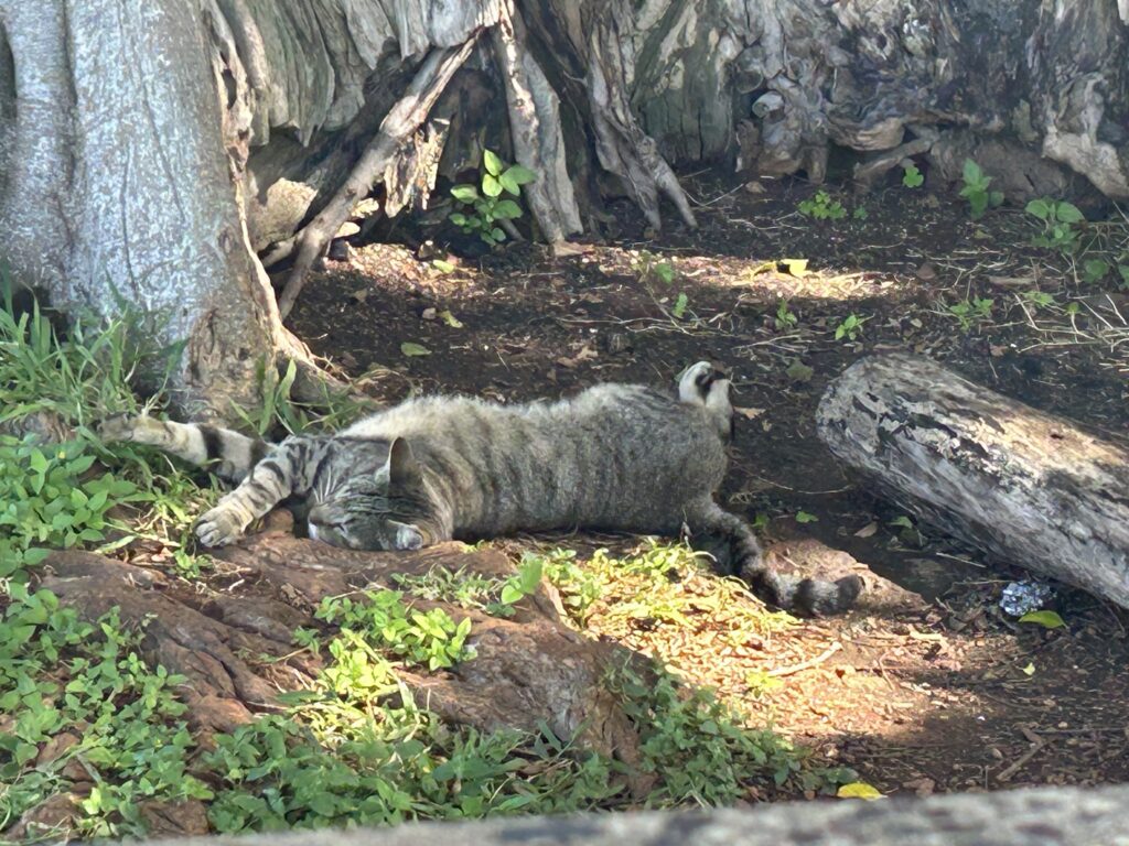 木の根元では2匹の猫が気持ちよさそうに寝ている。