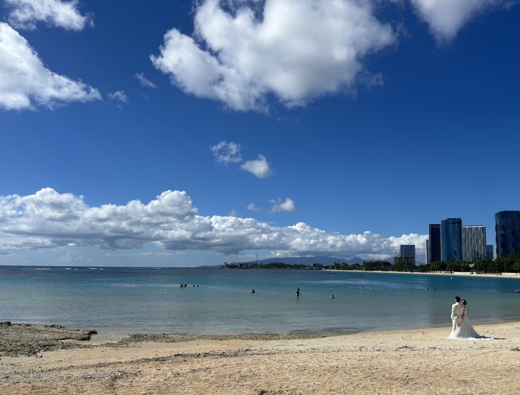 数時間ぼーっと過ごし、アラモアナビーチの方へ歩いて行くと、ウエディングフォトを撮るカップルが何組も。