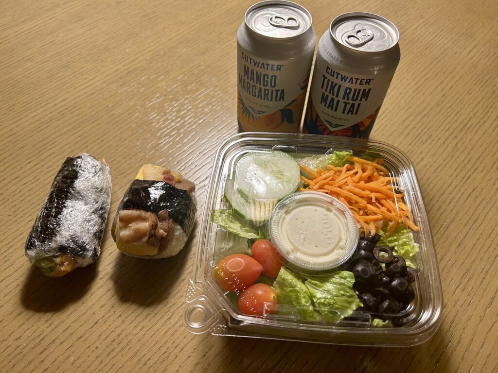 ベーコンエッグスパムとアボカドシュリンプロールを購入し(合計¥1,126)、ホテル近くのABCストアでグリーンサラダとお酒2本を購入し(合計¥3,172)、ホテルへ。