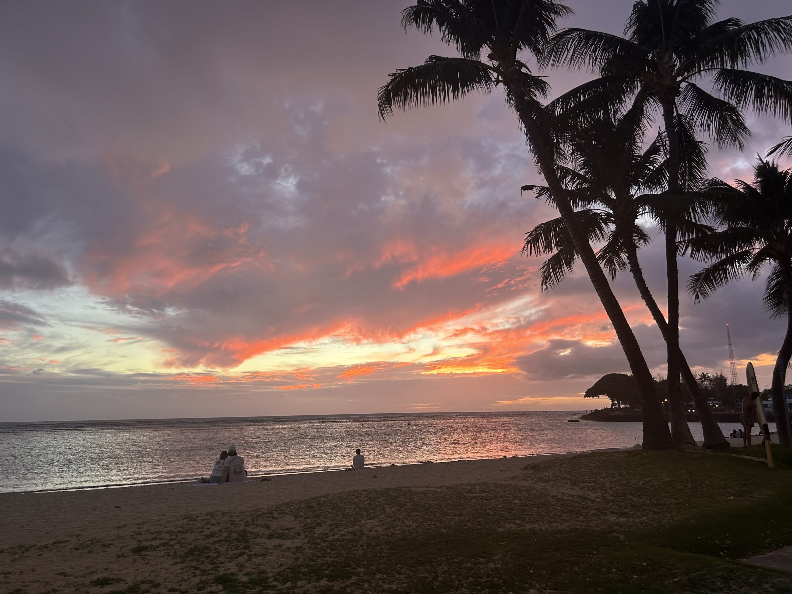 アラモアナビーチに近づく頃には、綺麗なピンクの夕焼けが空を染め、雨も上がり、この旅一番の記憶に残る絶景を目にすることができました。
